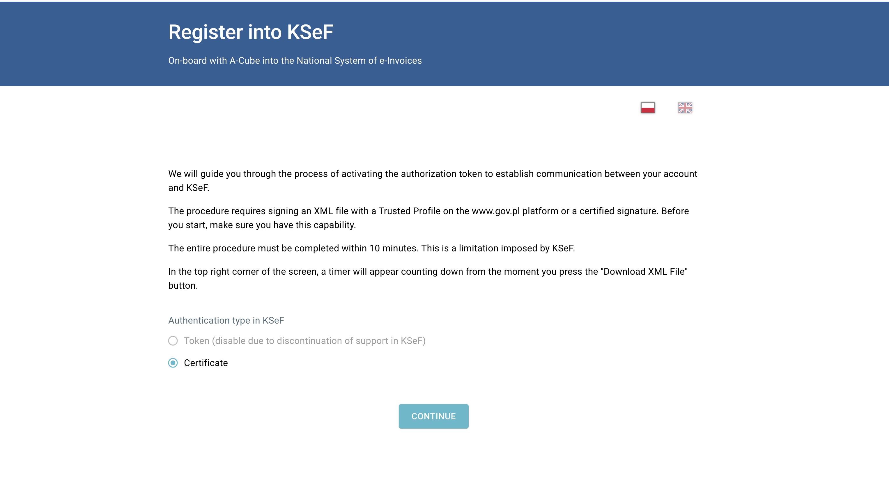 2. Select Certificate as the KSeF authentication type, then click Continue