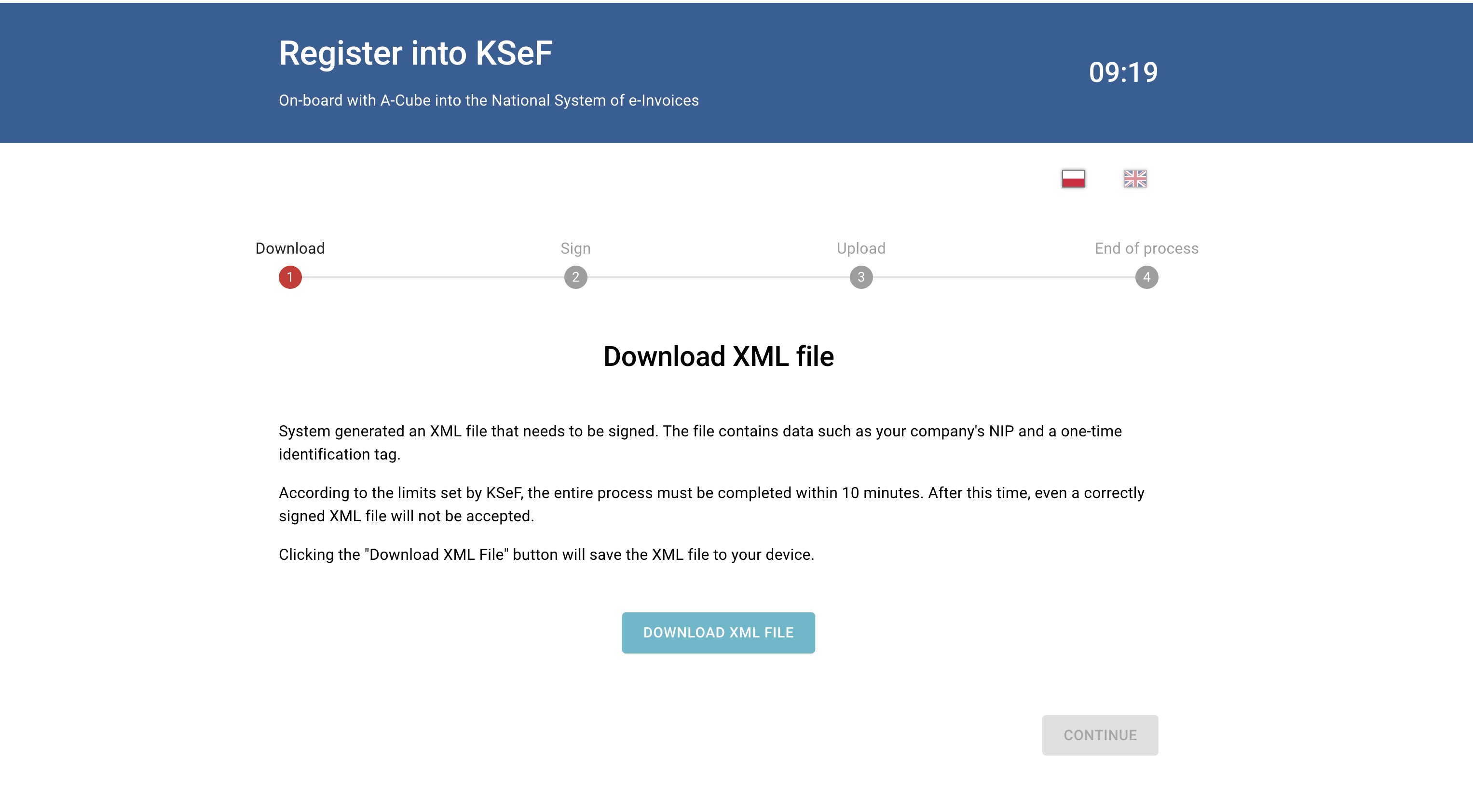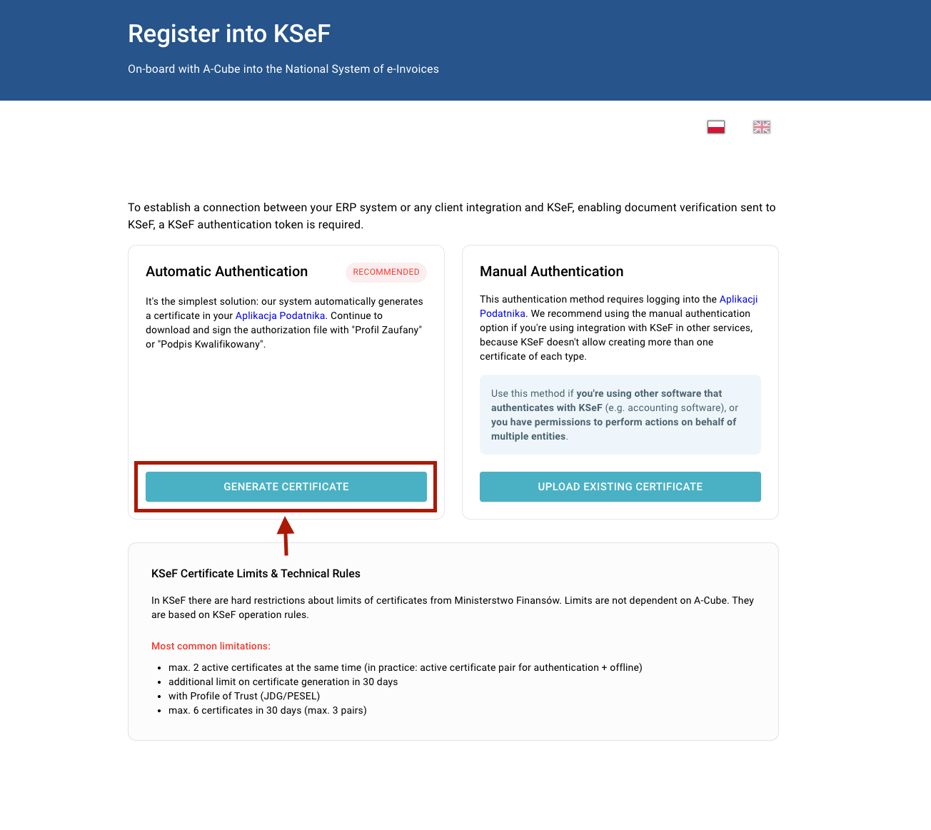 This tutorial shows how to authenticate to KSeF using the guided automatic flow in the A-Cube dashboard.