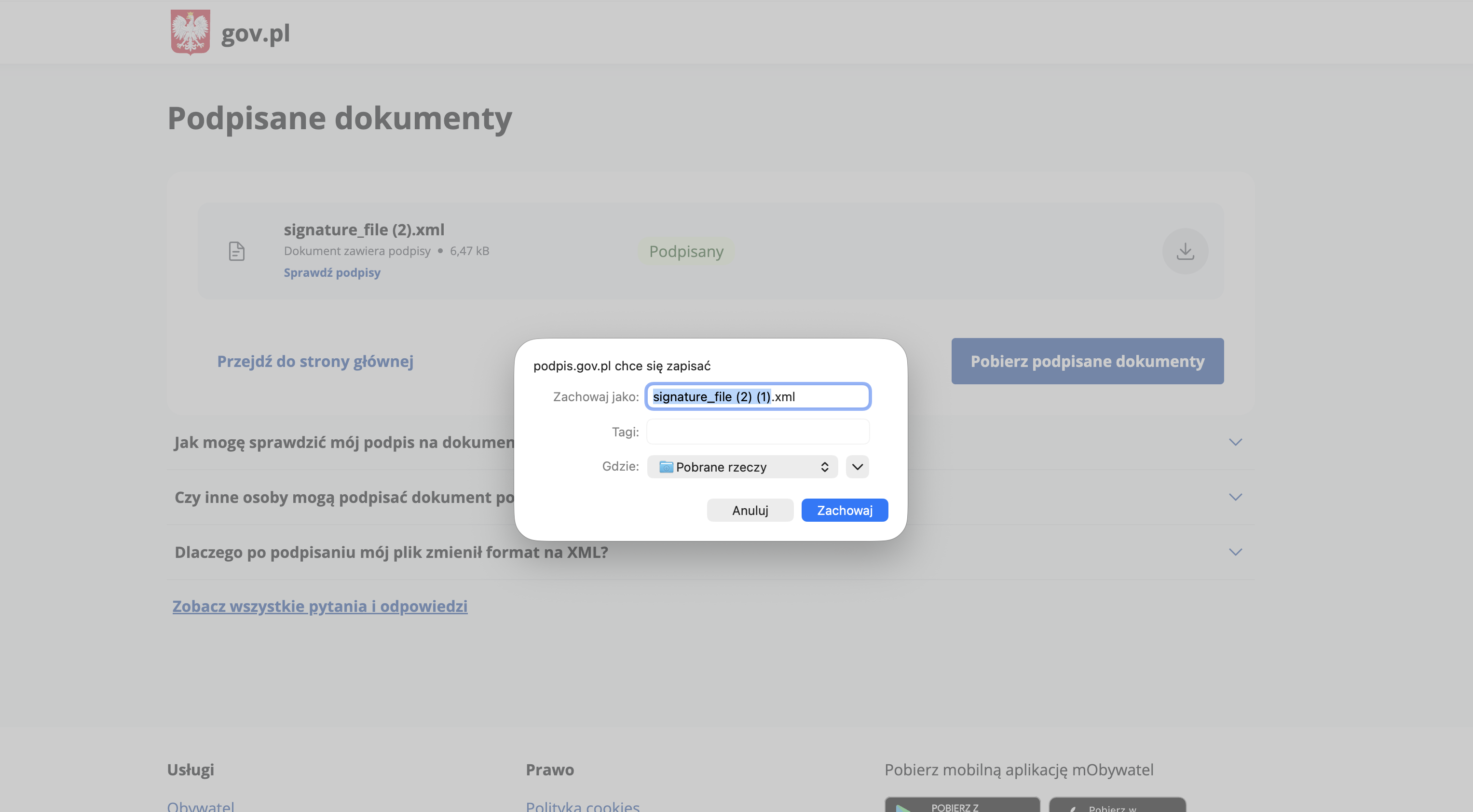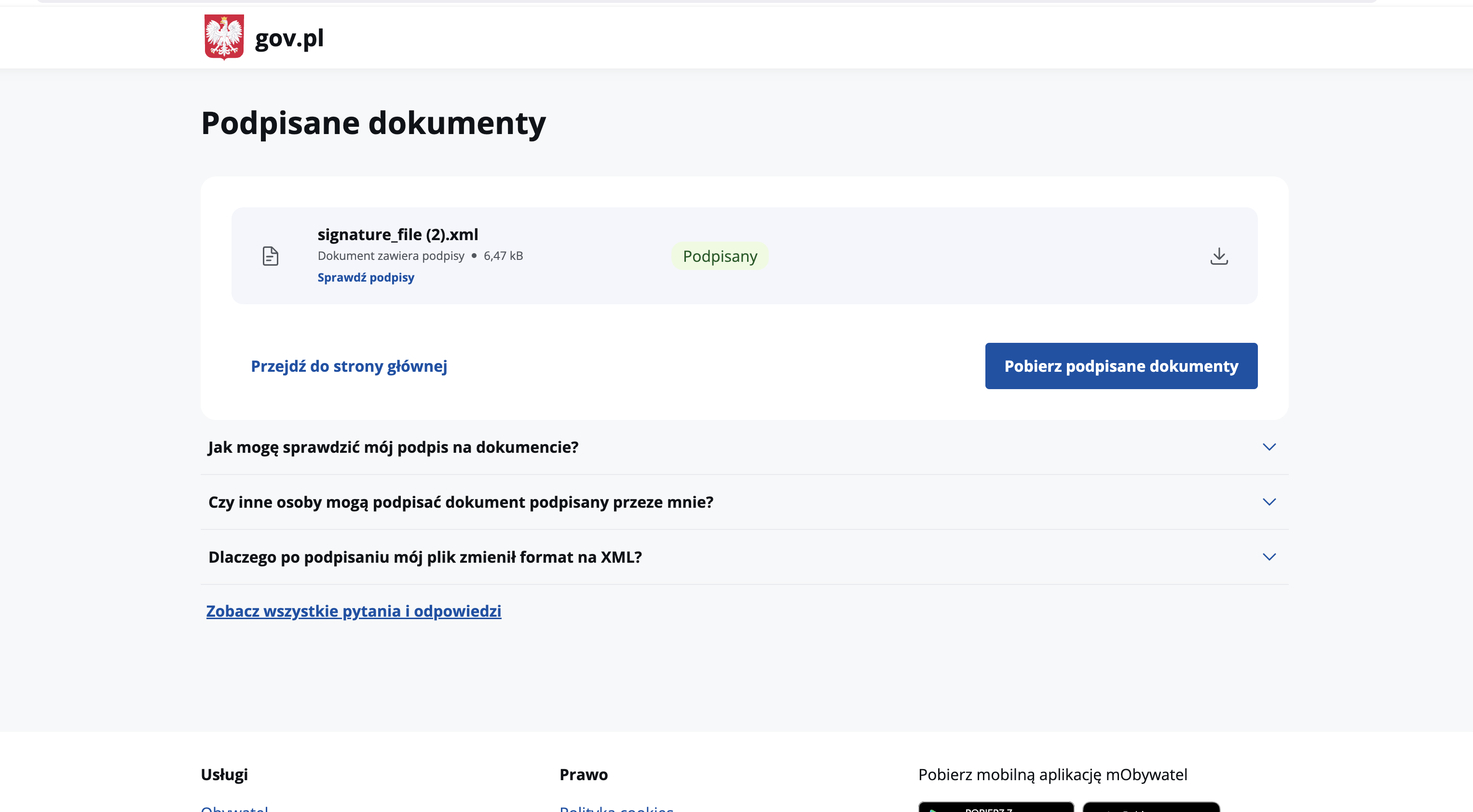 10. After successful signing, click Pobierz podpisane dokumenty (Download signed documents).