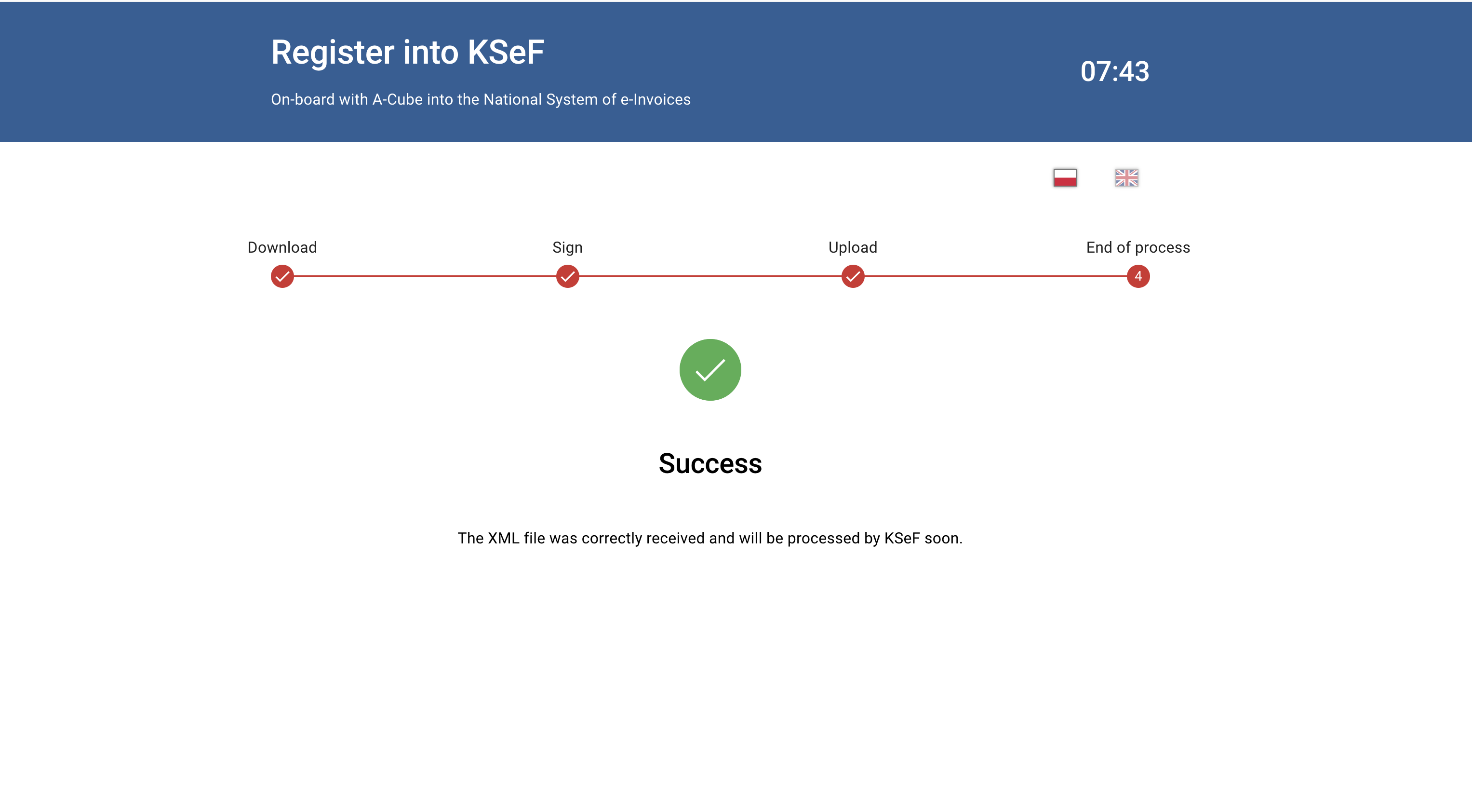 Success means A-Cube has received your signed XML and forwarded it for KSeF processing.