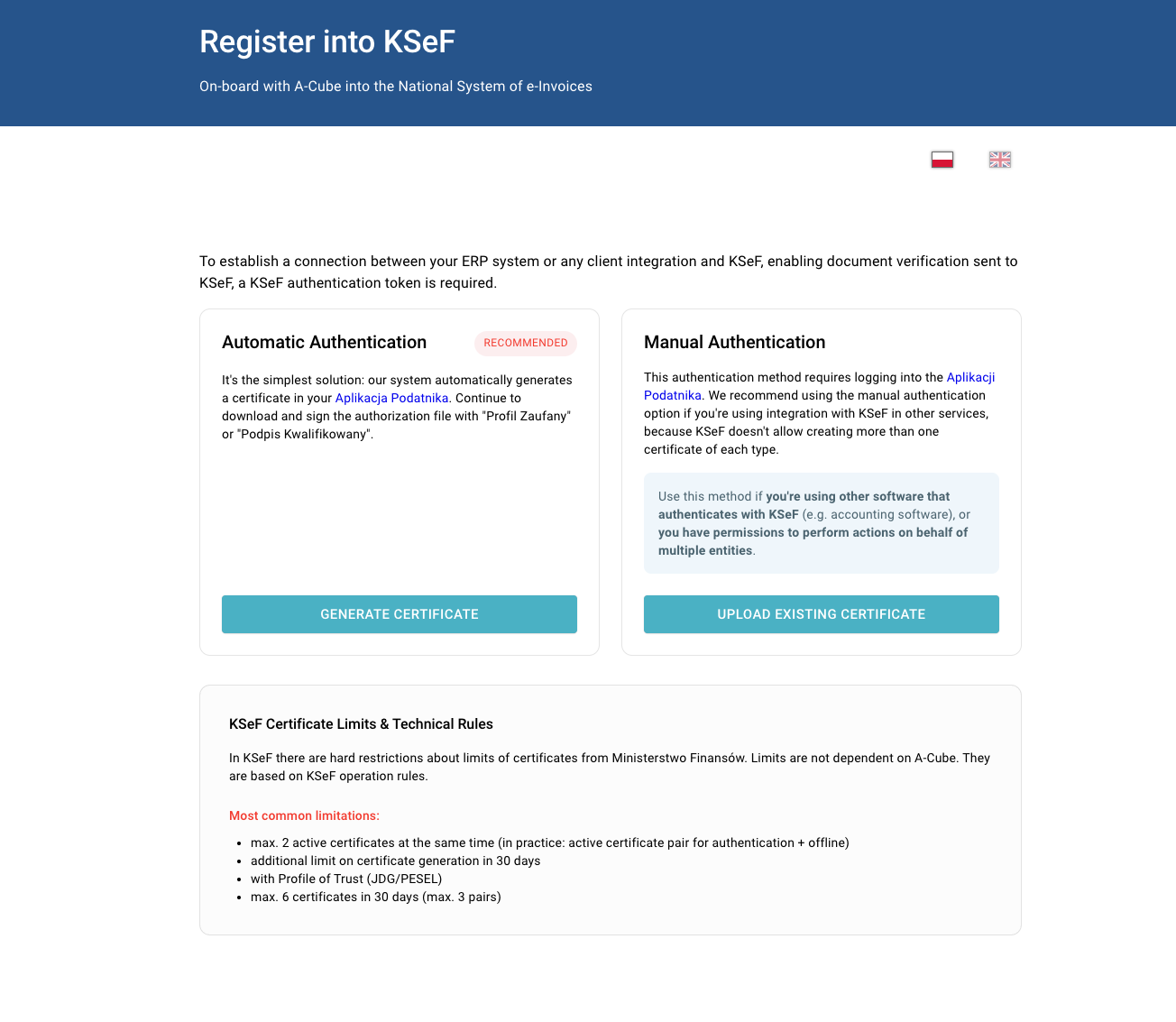 As shown in the picture, A-Cube supports two methods for connecting to KSeF:
